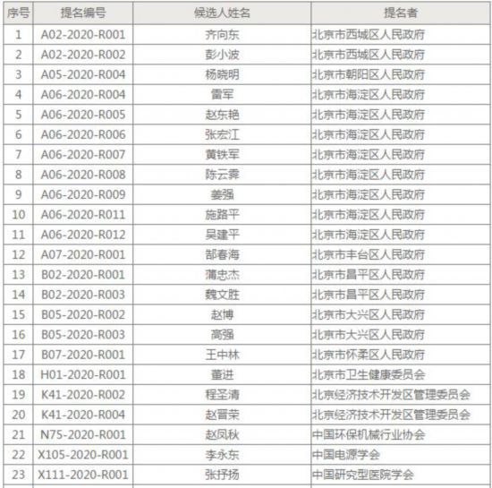 北京市科學技術最高獎——突出貢獻中關村獎提名名單
