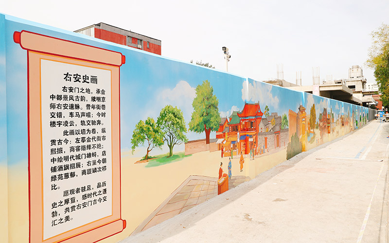 《右安史畫》由豐台區右安門街道辦事處組織創作,這幅 55 米長的彩繪牆以右安門城門為視覺中軸,左側鋪展金中都與明京城的繁華市井,景風門、中都水關、右安門等歷史地標錯落點綴﹔右側則勾勒右安門街道的現代化風貌,中國出版集團、北京南站、京印國際中心、西鐵營萬達等當代地標鮮活呈現。作品通過精妙的構圖設計與視覺引導,讓古路與今道在城門處自然交匯、時空疊合,營造出 “一步跨千年”的沉浸式穿越體驗。