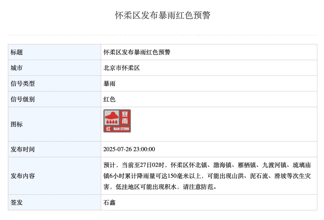预计,当前至27日2时,怀柔区怀北镇、渤海镇、雁栖镇、九渡河镇、琉璃庙镇6小时累计降雨量可达150毫米以上,可能出现山洪、泥石流、滑坡等次生灾害,低洼地区可能出现积水,请注意防范。