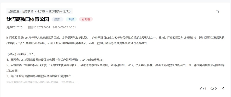 该网友表示,北京沙河高教园是年轻人较多的区域,附近9所高校,近11万师生及居民缺少免费的户外公共运动场所,不利于校际及居民间的沟通活动。该网友建议,探索在北京沙河高教园建设体育公园,24小时免费开放,激活沙河高教园区的活力,逐步形成有特色的体育创新和消费生态。