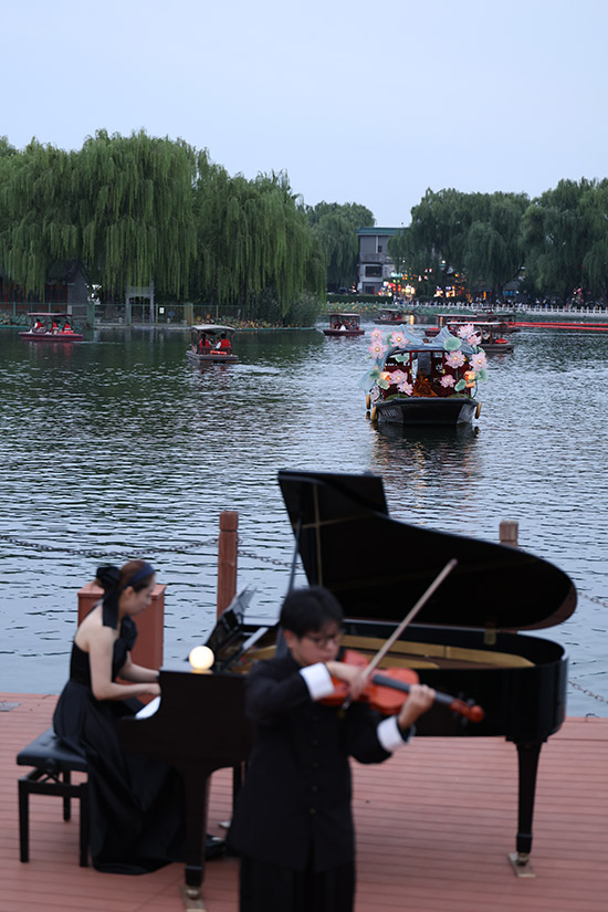 活动设置了水上移动舞台,一艘精心装饰的古典花船,伴着粼粼波光飘荡而来——中国戏曲学院的青年演员们,以精湛的唱腔和优美的身段,将京剧《白蛇传》的美,展现得淋漓尽致;民乐艺术家则用悠扬婉转的萧笛合奏,让这片水域瞬间进入空灵,波光桨影、水天一色、花团锦簇、余音绕梁。
