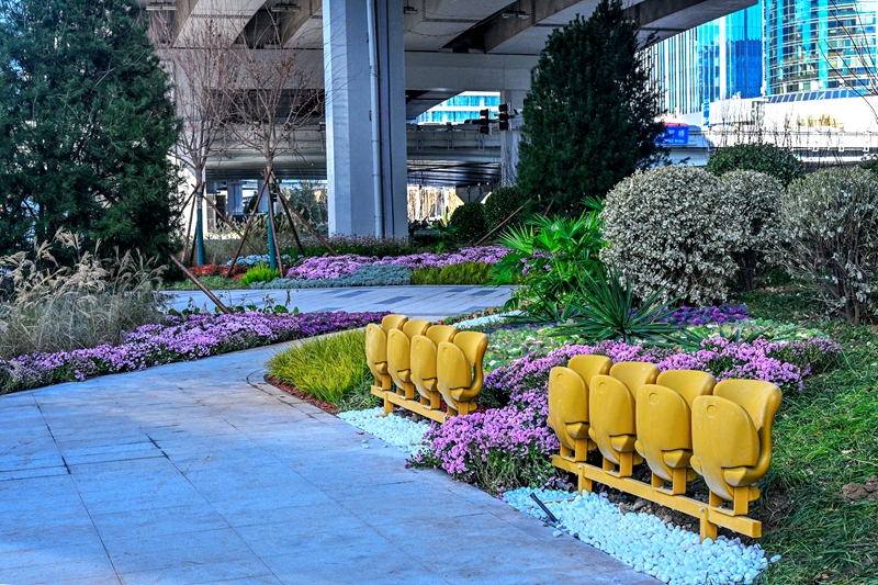 景观综合提升方面,兼顾“美观+实用”,打造生态优美、景致雅致的景观体系。通过整合地铁站前广场、建筑前区空间,推动桥下空间与周边环境有机衔接,全断面绿化面积从1.4万平米增至3.8万平米,增幅达170%,精选耐阴植物,构建桥下精品绿化景观;配套布设夜景照明系统,同步完成3.7万平米桥梁外立面粉刷、47根线缆清理,让桥下空间既通透又美观。