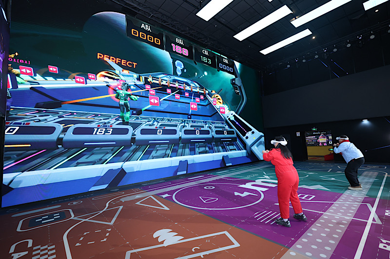 值得一提的是,本届庙会进一步促进商科融合,突出“好吃好玩好礼送”的特色亮点。银河通用与fudi联手推出“机器人售卖商场好物”,加速进化联合迪卡侬打通运动消费场景,机器人在耀莱影城陪你一起看电影……智能科技与线下商业场景深度融合,提升消费体验的趣味性与便捷性。其中,全国首家巨幕沉浸游戏空间——耀莱一号Mirra奇镜派对融合厅,将打造潮玩社交新场景。厅内配备有三面4KLED互动巨幕与多源融合动作捕捉系统,观众可以佩戴VR设备在巨幕前奔跑跳跃,屏幕中的虚拟角色随之灵动闪现。