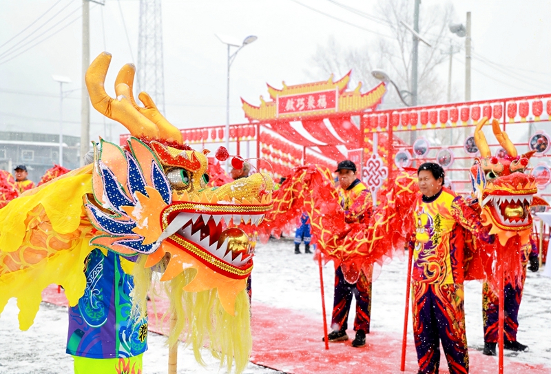 活动现场,民俗秧歌、舞龙舞狮等节目轮番表演,更有机器人与巡场队伍共舞,传统秧歌与科技节奏碰撞出别样火花。场边,小吃、非遗、特产等二十余个摊位铺展开来,非遗摊位上,手工艺人现场展示传统技艺;小吃摊前热气腾腾,炸糕、糖葫芦等特色美食香气四溢。场间还穿插着“愤怒的小鸟”“趣味抓大鹅”等互动游戏,孩子们玩得不亦乐乎。